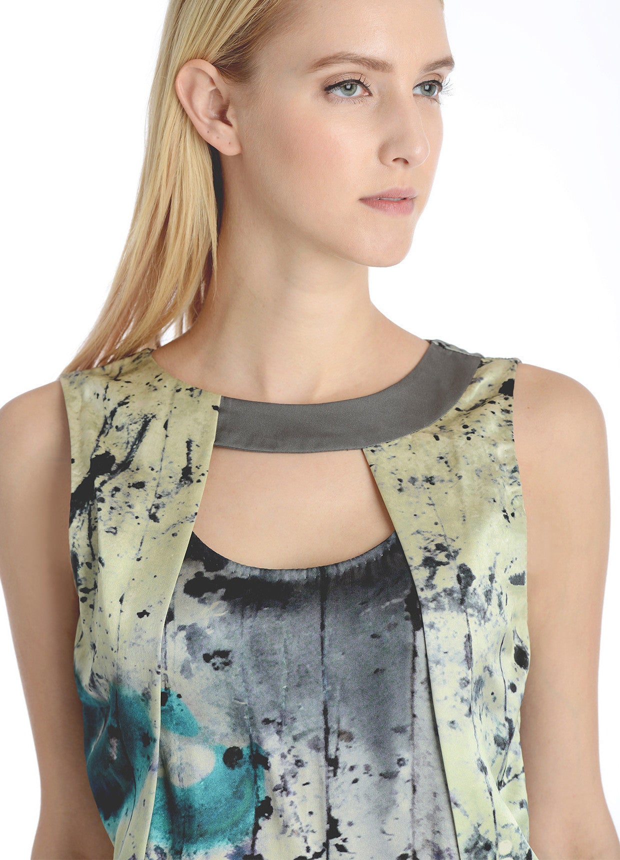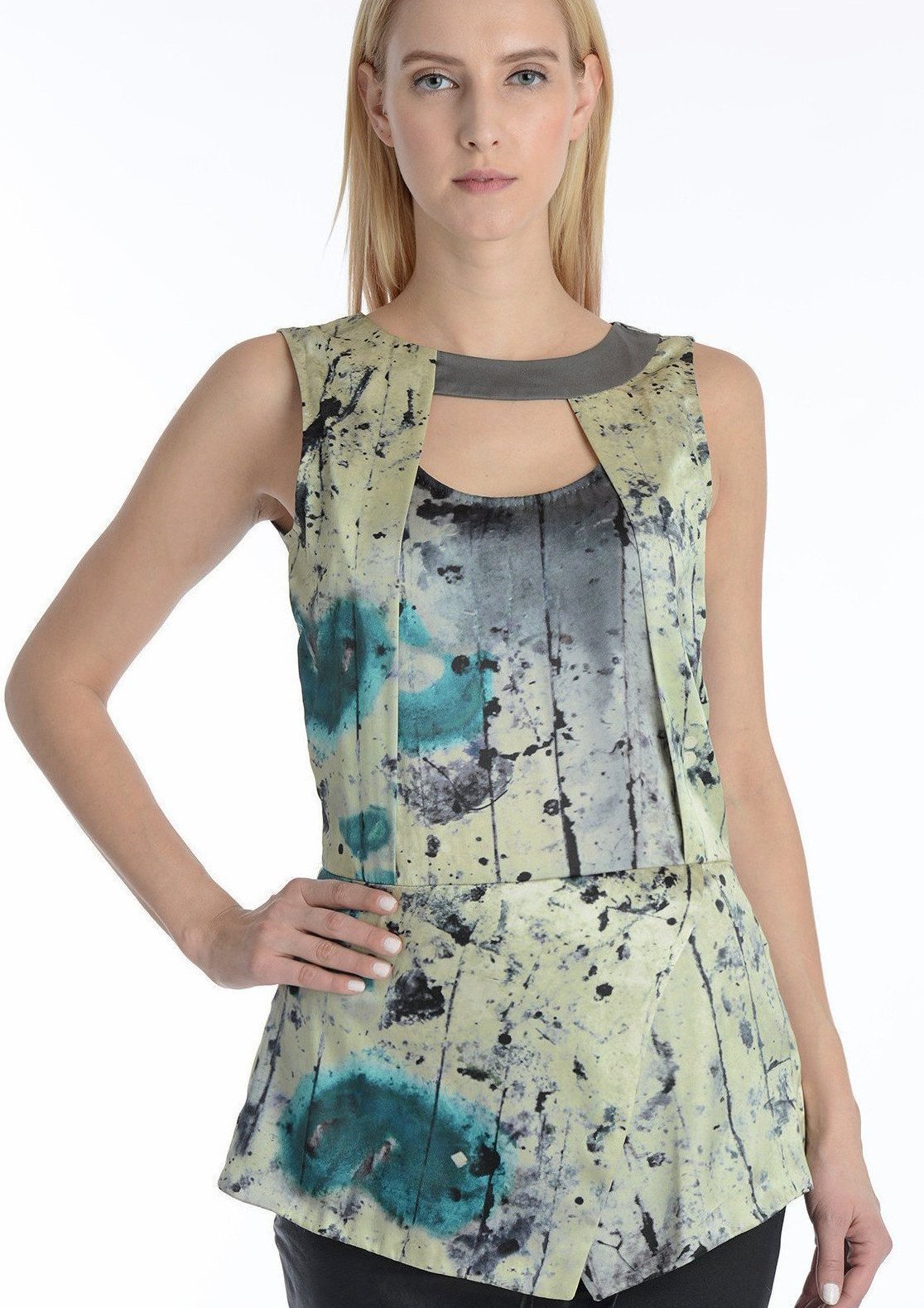 - Forrest print sleeveless top w/ cutout asymmetrical neckline