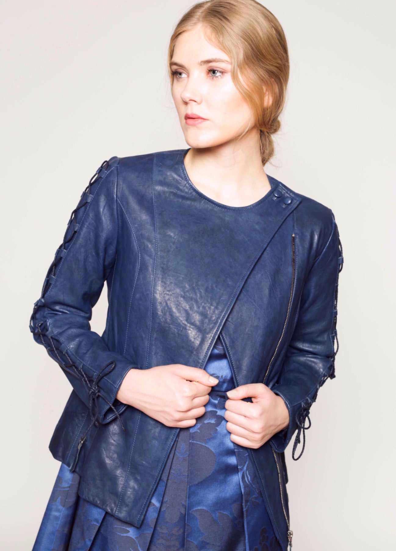 - Eco-friendly Vegetable dyed Leather jacket with lace-up sleeve detail
