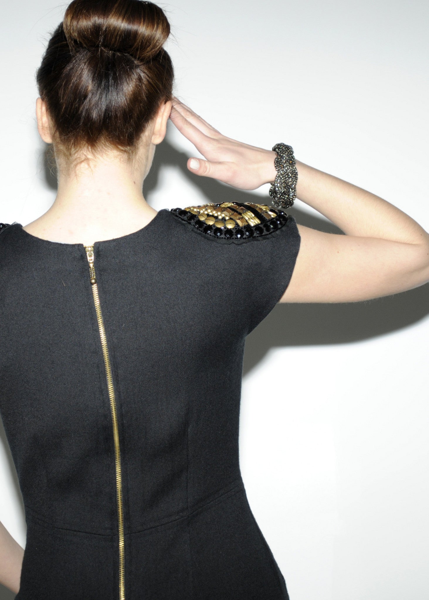 - Fitted wool crepe little black party dress w/ gold metal studs and beading on shoulder.